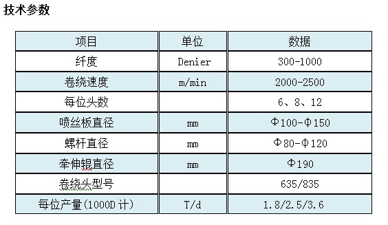 丙綸高強(qiáng)FDY紡牽聯(lián)合機(jī)主要特點(diǎn) 1.螺桿為加長型,變頻及壓力調(diào)節(jié)儀器為進(jìn)口品牌 2.采用了新型高效節(jié)能型紡絲箱體,比普通紡絲箱節(jié)能。 3.采用上裝式組件,方便紡絲工操作。 4.側(cè)吹風(fēng)系統(tǒng),風(fēng)速均勻穩(wěn)定,纖維條干好。 5.采用感應(yīng)或高頻加熱牽伸輥輥,降低能耗。 6.多種組合的多級牽伸和熱定型方式可滿足丙綸牽絲不同性能的要求。紡絲強(qiáng)度大于7g/d 7.采用全自動(dòng)卷繞頭,切換成功率高,廢絲率低,成形良好。 8.溫控儀表、變頻器為進(jìn)口品牌。